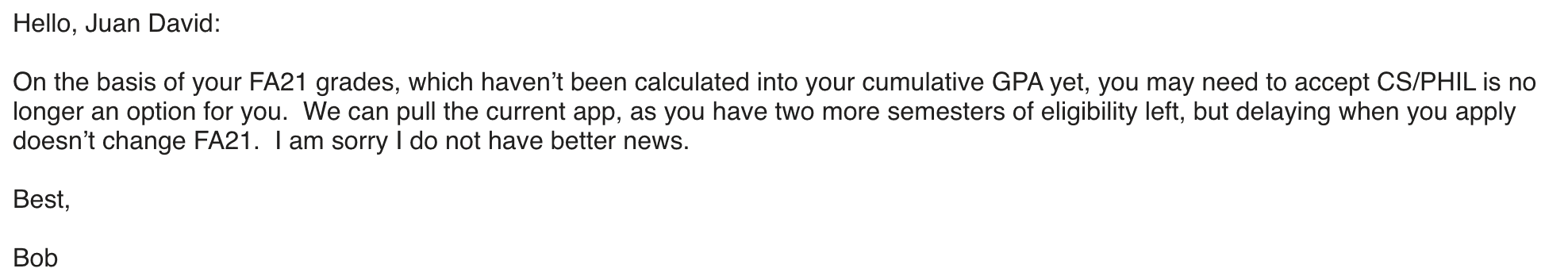 Wait for the engineering decision. Two outcomes. 1) I get in, which is unlikely and probably don’t want to happen. 2) I don’t get in. I need to find a new major and fit the classes I want to take in philosophy, math, physics, and economics.