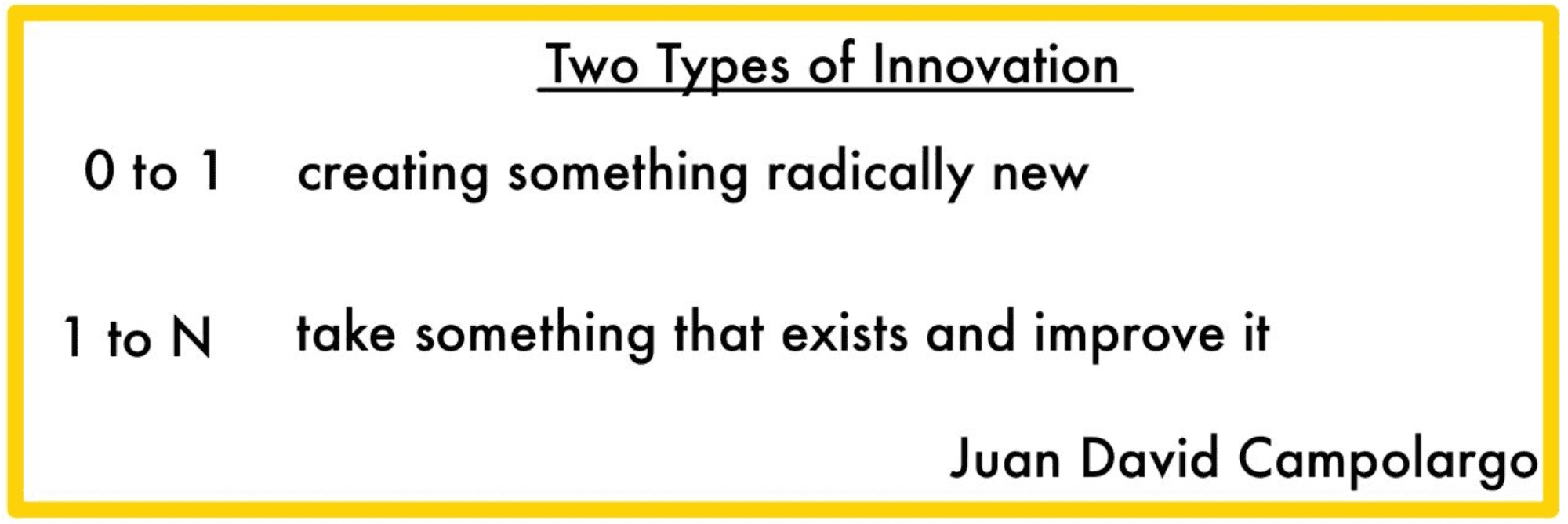 0 to 1 is solving problems people have but didn’t know could be solved. While 1 to N explicitly solves problems, people want to be solved. Neither is better, rather they complement each other as we need both. However, we can’t generalize one approach to all methods of innovations and ideas.