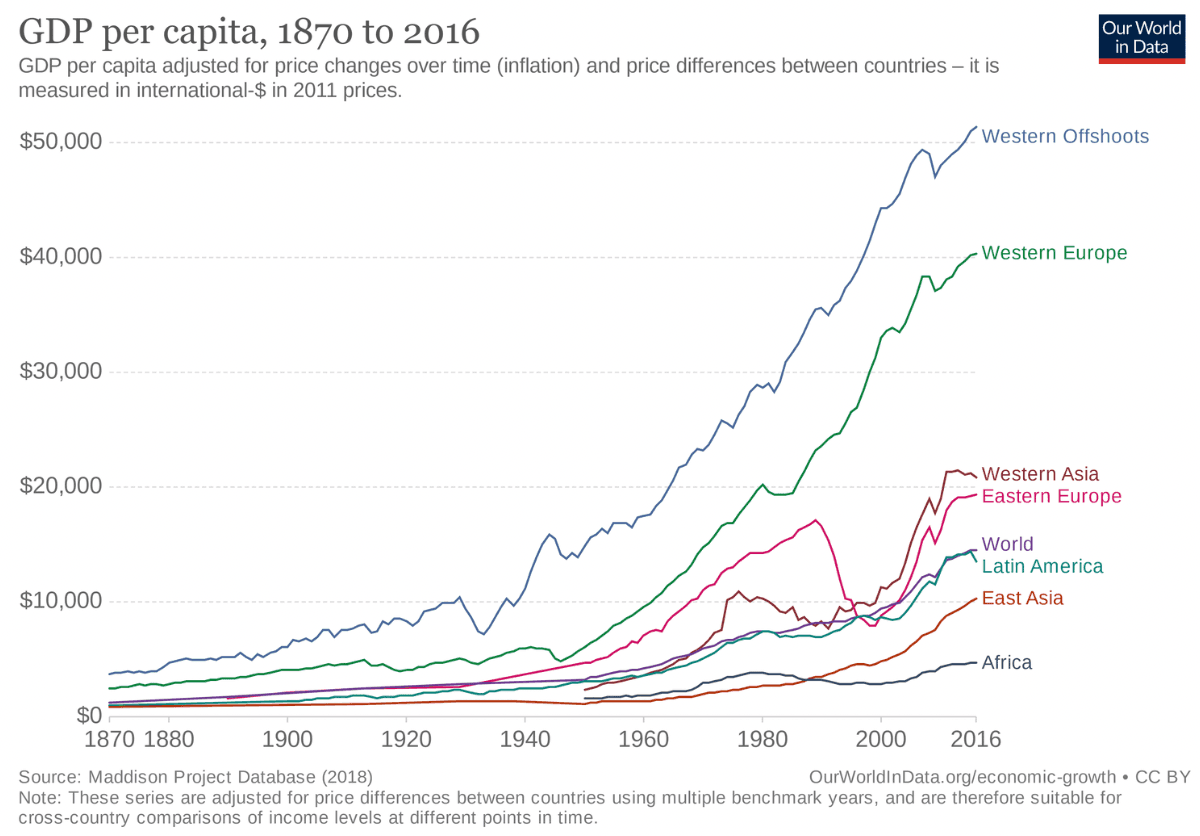 We began using credit more and more from about the 1920s. And plastic materials became more widespread from about the 1940s, giving rise to the sudden and almost linear increase in GDP per capita in the most developed countries of the world.
