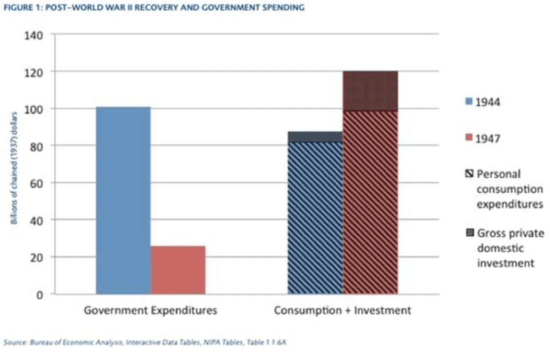 Yet this “destimulation” did not result in a collapse of consumption spending or private investment. Real consumption rose by 22 percent between 1944 and 1947, and spending on durable goods more than doubled in real terms.